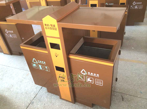 F238戶外分類垃圾桶,外桶為足1.2mm鍍鋅板,表面噴塑工藝,內膽為201#,厚足0.75mm, 螺絲螺母為304不銹鋼材質,采用不銹鋼膨脹螺 安裝。噴塑顏色為土豪金色,垃圾桶開口位置坐折邊處理,箱體帶簡易防盜鎖。左右兩邊分別絲印,可回收物,其他垃圾等圖案標志。中間橙黃色區域,印有美的·鷺湖森林度假區,廢電池光碟字樣,字體顏色為土豪金色。欣方圳工程師采用金色的獨特性的設計風格,特別受到物業,房地產,機場,小區等單位的青睞。