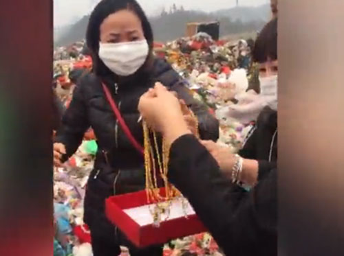 現(xiàn)場(chǎng)視頻顯示,7名女子在一垃圾場(chǎng)中捧著首飾盒正核算尋回的金項(xiàng)鏈數(shù)目,其中一黃衣女子倚靠在身旁黑衣女子肩膀上大哭。核算完項(xiàng)鏈數(shù)目后,眾人紛紛說(shuō)道:“好了好了,走了走了。”