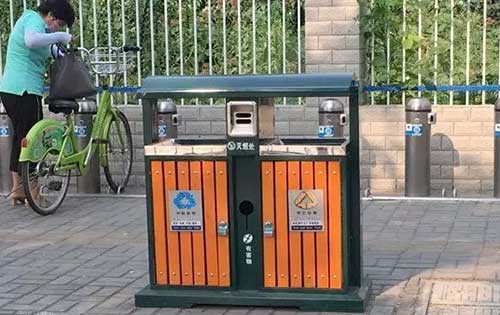在澮水路、淮河路等路段看到,街道兩旁都設有垃圾分類箱,每隔百十米就能看到一個,這些垃圾箱左右兩邊的箱體表面均有綠色“可回收物”和黃色“其它垃圾”的標識,“可回收物”下面標志著紙類、玻璃、金屬、塑料等,“其它垃圾”的下面標志著果皮、樹葉、食品殘留、灰土等。垃圾箱的頂部中間位置設有“投煙處”和“有害物”等。