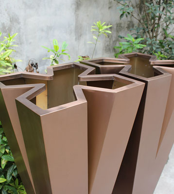 • 使用范圍:不銹鋼高V字形美陳花器電鍍花盆擺放商業街、城市廣場、小區、旅游景點、公園、商業廣場、海灘、高爾夫球場、地產園林、庭院、售樓部門前、別墅花園、小區泳池岸、私家花園、度假酒店等場所,不同款式不銹鋼金屬花盆,具有光滑亮麗、高檔美觀、堅固耐用等特點,融入室內外景觀環境配成一條自然的風景線。不僅具有綠化裝飾的功能上還能凈化空氣,感受自然懷抱,呼吸新鮮空氣、享受悠閑生活。