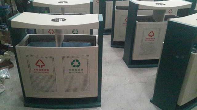 • 產品材質:欣方圳鋼板戶外垃圾桶采用優質冷軋鋼材料經剪鈑下料、折彎、沖壓、焊接、打磨、等工藝:表面經過除油、噴砂防銹處理后,再進行酸洗磷化處理;表面清理干燥后整體進行靜電噴涂或烤漆處理,靜電噴涂是經過流水線高溫固化爐固化后再出爐冷卻,加工后的塑粉附著力強,不易剝落;